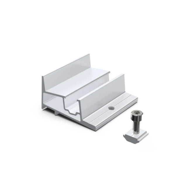A Mountkit FLAT10 első láb a lapostetős napelemes tartószerkezet elülső megtámasztó eleme. Feladata a napelemmodulok alsó részének alátámasztása, valamint a panelek kezdő magasságának meghatározása. A hátsó lábbal együtt biztosítja a rendszer rögzített, 10°-os dőlésszögét.